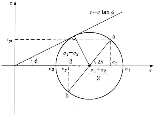 静止粉体層のある面に種々の垂直,せん断応力(剪断応力)を働かせると,静止の状態を保つ場合と粉体層の滑り崩壊が生じ流動しはじめる場合に区別される。この静止と流動のちょうど境界の応力状態を限界応力状態という。粉体層をある面に沿ってせん断(滑り崩壊)しようとすると,それに必要な剪断応力 $\tau$ はその面に働く垂直応力 $\sigma$ に依存する。すなわち,粉体層内にある点または面で滑り崩壊が起こるとすると,正確には崩壊が起こる寸前にはこの点または面素上に作用する $\sigma$ と $\tau$ の間には一定の関係が存在する。この関係を降伏関数または破壊包絡線という。粉体層の応力はモールの応力円で表わされるが,粉体層が限界応力状態にあるとその面の応力はモールの応力円と降伏関数のいずれをも満足しなければならない。したがって限界応力状態では降伏関数はモールの応力円に接することになる。この関係を図に示す。最大主応力と $x$ 軸のなす角を $\theta$ とすると図の a 点の横および縦座標から$\sigma_{x}$ と $\tau_{yx}$ が求まり,b 点のそれから $\sigma_{y}$ と $\tau_{xy}$ が求まる。すなわち次式になる。